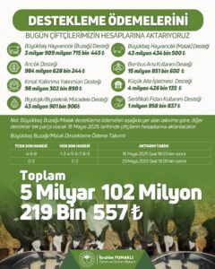 Bakan Yumaklı yaptığı açıklamada:Alın teriyle toprağı yoğuran çiftçimizin her zaman yanındayız. 5 milyar 102 milyon 219 bin lira destekleme ödemesini bugün çiftçilerimizin hesaplarına aktarıyoruz. Hayırlı ve bereketli olsun” ifadelerini kullandı.
