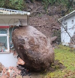 Şalpazarı’nda sabah saatlerinde korku dolu anlar yaşandı. Şalpazarı’nda sabah saat 08.00 sularında meydana gelen olayda, kopan bir kaya parçası su arıtma tesislerine ait görevli lojmanlarının bulunduğu alana düştü. Olayda can kaybı ya da yaralanma yaşanmazken, lojmanlarda maddi hasar oluştu.